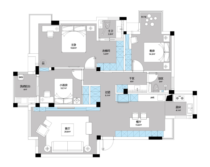 3.把過道的位置縮短,借用小孩房的空間,讓主臥室增加衣帽間的功能。