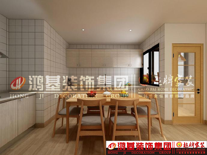 圖二:是一個餐廳區(qū)域,和廚房規(guī)劃在一起做了一個開放式廚房,靈活的動線使餐廳和廚房增加了一分生活的韻味。超大的臺面地柜滿足收納空間。